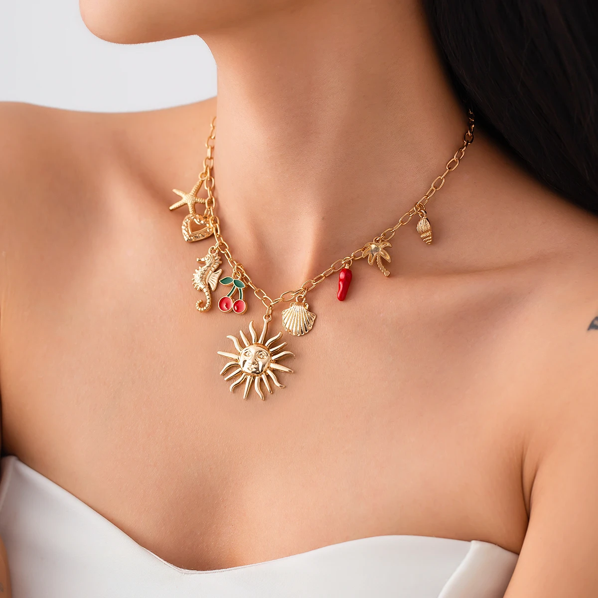 Bring a touch of vintage charm to your outfit with the Sun & Sea Pendant Necklace. Featuring a delicate geometric sun and sea-inspired pendant, this necklace is perfect for adding subtle elegance to both casual and party ensembles.